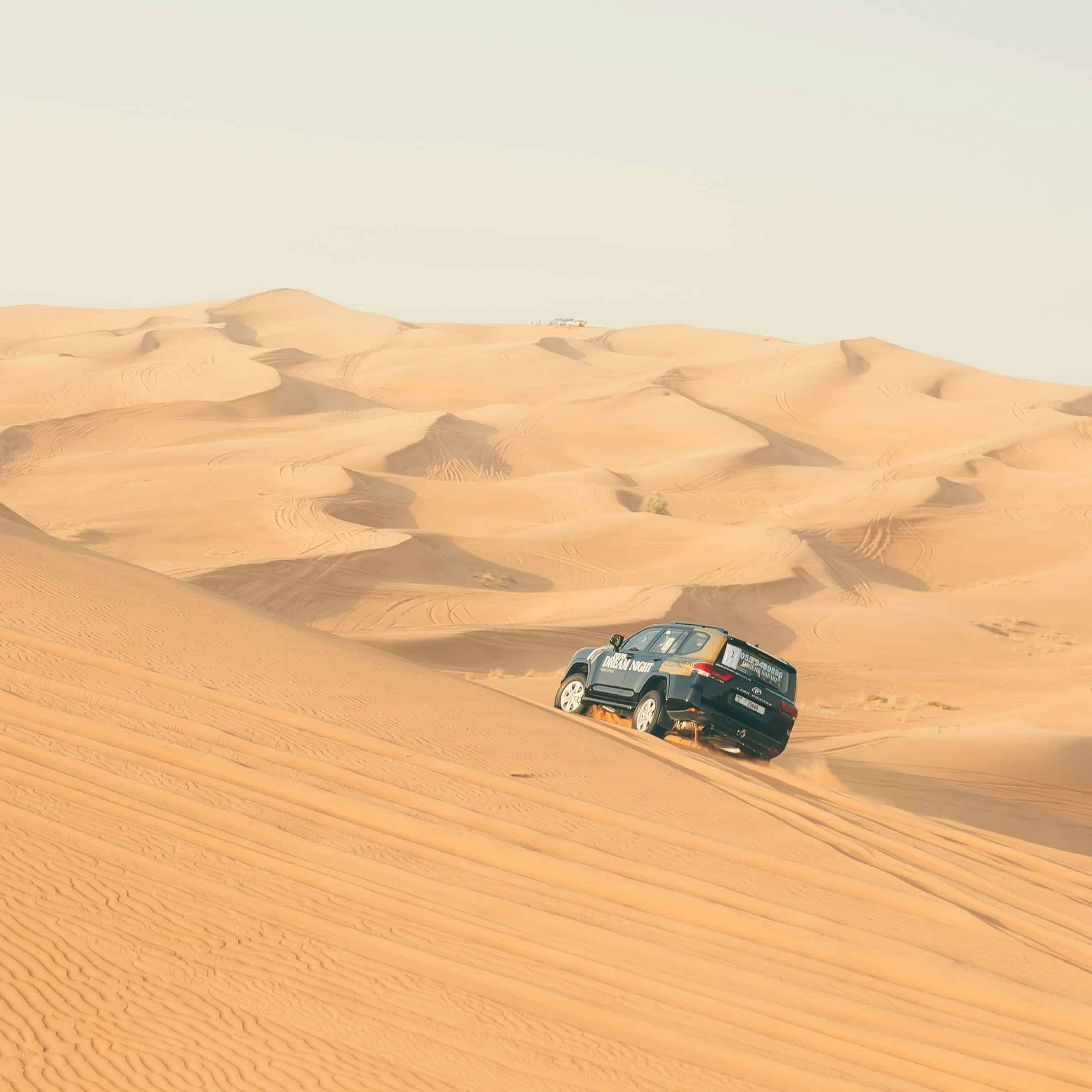 A: Dune bashing is a thrilling 4×4 off-road ride across the desert dunes, typically using modified SUVs like Toyota Land Cruisers, led by trained drivers.